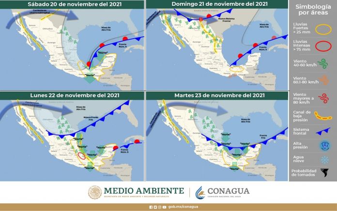 Se prevé a partir del domingo temperatura máxima de 32°C y mínimas de 14°C, con viento moderado de dirección noroeste de 20-30 km/h con rachas que podrían superar los 50 km/h principalmente en zonas costeras. Se mantendrá clima frío en zonas altas (mínima de 7°C durante la noche en Miquihuana). Alta probabilidad de lluvia ligera a moderada puntual durante el ingreso del fenómeno.