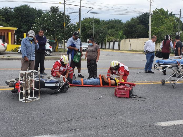 El conductor de la motocicleta acabo noqueado sobre el pavimento, cuándo al salir de un fraccionamiento e intentar incorporarse sobre la carretera, fue impactado por una camioneta que conducía una mujer.