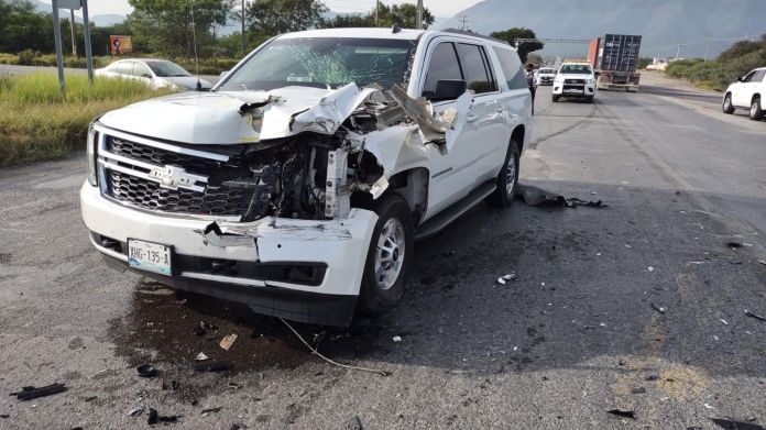 Cd. Victoria, Tam.- Un presunto funcionario resultó lesionado cuando la camioneta blindada en la que viajaba quedó destrozada al estrellarse en la parte posterior lateral de un camión torton.