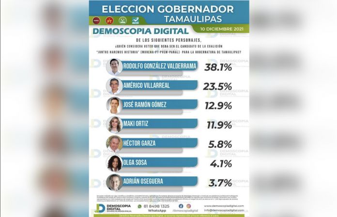 De acuerdo al más reciente estudio de Demoscopia Digital correspondiente al pasado 10 de diciembre, en la medición de los 7 aspirantes de Morena a la candidatura a gobernador por esa entidad del noreste de la república, los resultados fueron los siguientes: