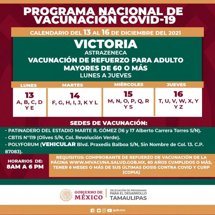 Cd. Victoria, Tamaulipas, 10 de diciembre de 2021.- El próximo lunes inicia en la capital de Tamaulipas el programa de vacunación anti-Covid-19 tercera dosis para adultos mayores de 60 años y su aplicación será en orden alfabético en los módulos “El Patinadero” y CBTIS 119. En el estacionamiento del Polyforum operará el módulo vehicular.