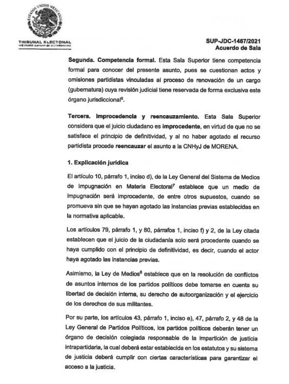 «Al no haberse agotado el recurso partidista procede reencauzar el asunto a la Comisión Nacional de Honor y Justicia de Morena».