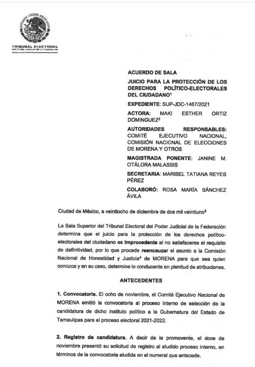 Por ser notoriamente improcedente, la Sala Superior del Tribunal Electoral del Poder Judicial de la Federación desechó la impugnación promovida por la ex alcaldesa de Reynosa Maki Esther Ortiz Domínguez en contra del proceso interno de Morena donde resultó electo el senador Américo Villarreal Anaya como único aspirante a la candidatura por la gubernatura de Tamaulipas.