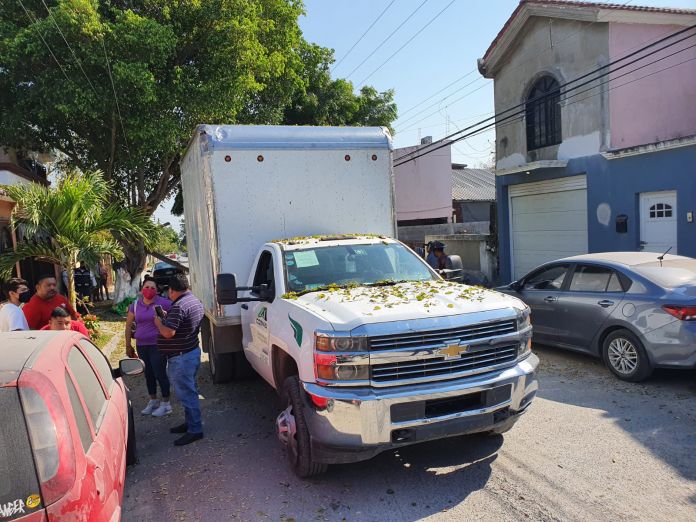 Cd. Victoria, Tam.- Un Aveo resultó dañado luego de que le cayera encima una rama de un árbol y la cual fue derribada por un camión.