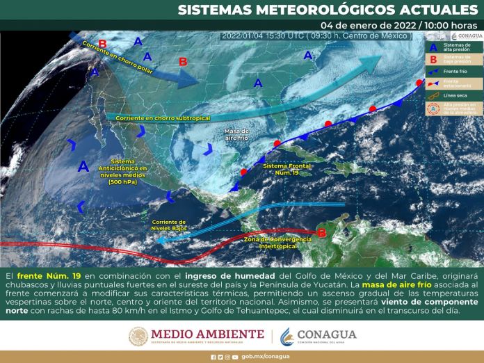 De acuerdo con el aviso meteorológico, al extenderse con características de estacionario sobre el oriente del Golfo de México, el frente frío número 19 originará chubascos y lluvias puntuales fuertes en el sureste del país.