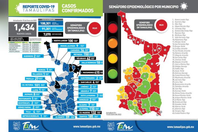 Tamaulipas cerró la jornada de este sábado con 1434 positivos a COVID-19 y 5 fallecimientos asociados a complicaciones graves, informó desde esta ciudad capital la secretaria de Salud, Gloria Molina Gamboa tras convocar a la población a atender las medidas emitidas por el Gobierno de Tamaulipas a través del Comité Estatal de Seguridad en Salud para mitigar el impacto de la pandemia.