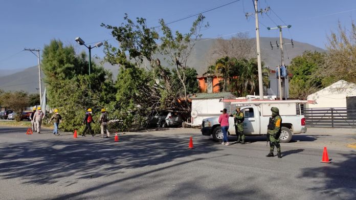 Al lugar acudió un camión tipo pluma de la CFE para auxiliar en las labores de retirar las ramas del árbol que quedaron sobre el cableado eléctrico.