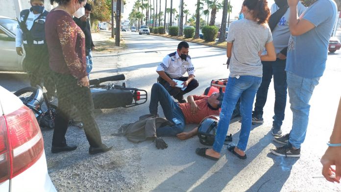Con probable fractura en una de sus extremidades inferiores resultó motociclista luego de impactarse contra el coche que manejaba una mujer y la cual le cerró el paso.