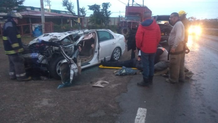 Testigos presenciales afirman que después de incrustarse tras el trailer, el policía salió de la cinta asfáltica y quedo atorado entre los fierros de su coche seriamente lesionado.