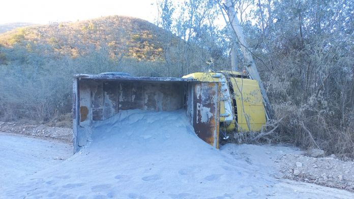 Un camión de volteo cargado con arena triturada terminó volcado a un costado del camino, luego de que su conductor perdió el control.
