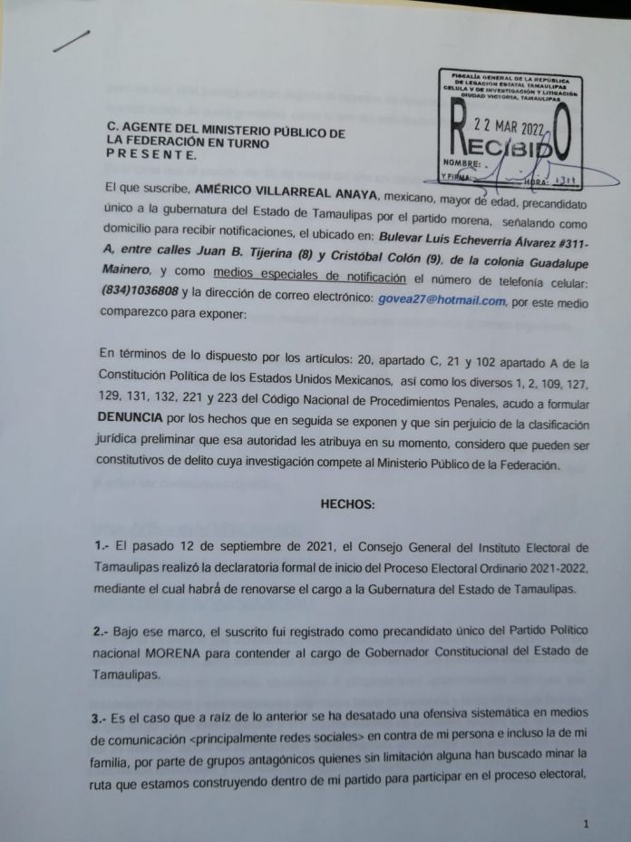 El precandidato único de Morena a la gubernatura de Tamaulipas, Américo Villarreal Anaya, presentó una denuncia de hechos ante la Fiscalía General de la República al considerar que «los ataques sistemáticos que ha recibido en contra de su persona a través de diversas publicaciones en redes sociales» pueden ser constitutivos de delito.