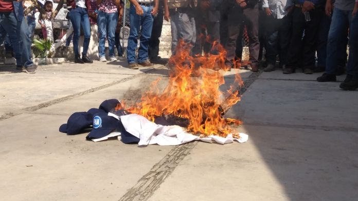 Tras concluir la rueda de prensa, los asistentes tiraron al suelo cachuchas, playeras y mantas con logos del Partido Acción Nacional para prenderles fuego.