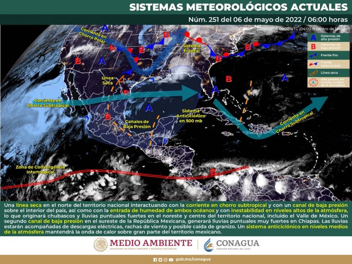 De acuerdo con el pronóstico, para hoy viernes persistirá una línea seca sobre el norte del territorio nacional interactuando con la corriente en chorro subtropical y con un canal de baja presión que se extenderá sobre el interior del país, así como con la entrada de humedad de ambos océanos y con inestabilidad en niveles altos de la atmósfera, lo que originará chubascos y lluvias puntuales fuertes en el noreste y centro del territorio, incluido el Valle de México.