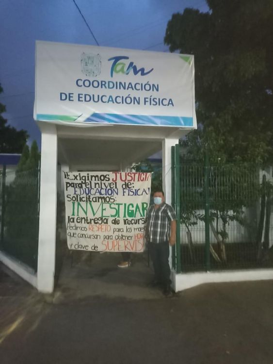 Cd. Victoria, Tam.- .- Exigiendo la destitución del coordinador de Educación Física a nivel estado profesor Arturo Pozos Cervantes, un grupo de maestros provenientes de diferentes municipios de la entidad mantienen una protesta en la Coordinación Estatal de Educación Física.