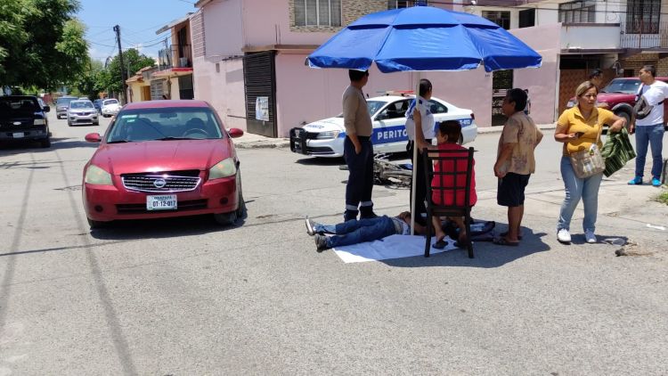 Al llegar al crucero con la calle Venustiano Carranza el motociclista ignoró un disco metálico de alto y se estrelló contra el costado de un automóvil de la marca Nissan.