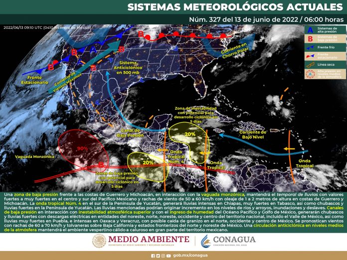 También se dio a conocer que una circulación anticiclónica en niveles medios de la atmósfera mantendrá el ambiente vespertino cálido a caluroso en gran parte del territorio mexicano.