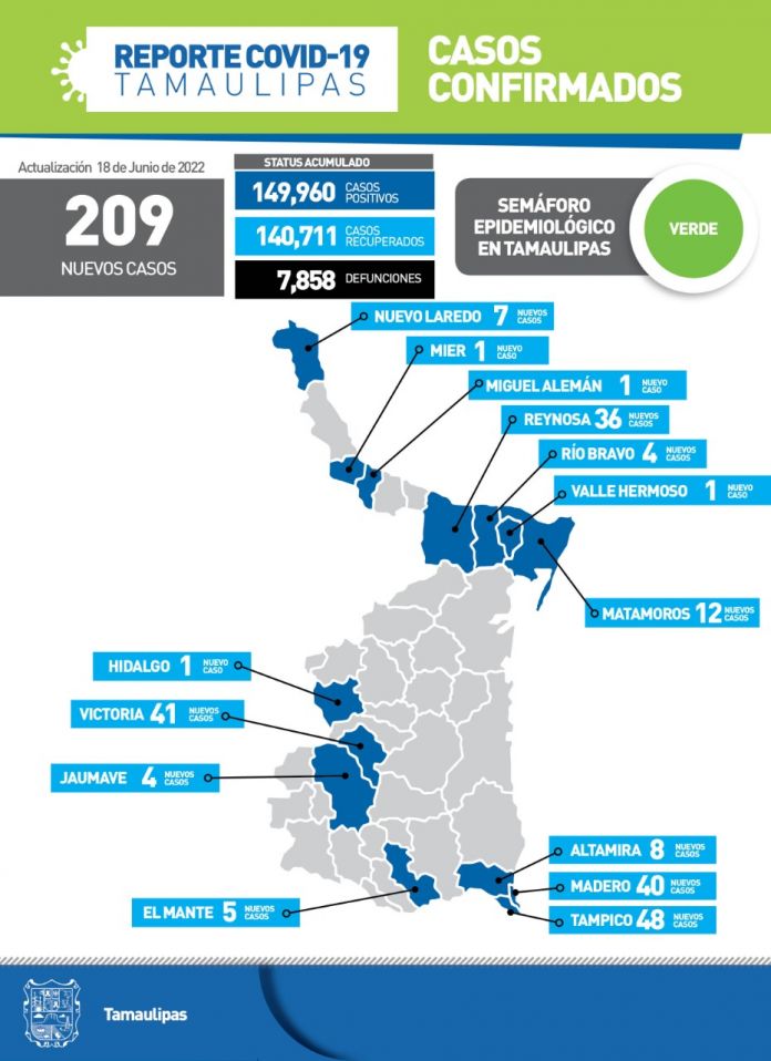 Ciudad Victoria, Tamaulipas.- La pandemia de COVID-19 sumó este sábado 209 nuevos casos a su conteo oficial sin ningún fallecimiento, informó desde esta ciudad capital, la secretaria de Salud, Gloria Molina Gamboa quien pidió a la población ser ciudadanos socialmente responsables y completar el esquema de vacunación.