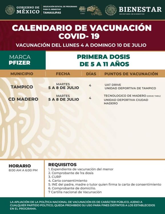 De igual forma, en Ciudad Madero la vacunación será del cinco al ocho de julio con las sedes de vacunación  habilitadas en el Tecnológico de Madero en la modalidad Drive Thru y la Unidad Deportiva de Ciudad Madero.