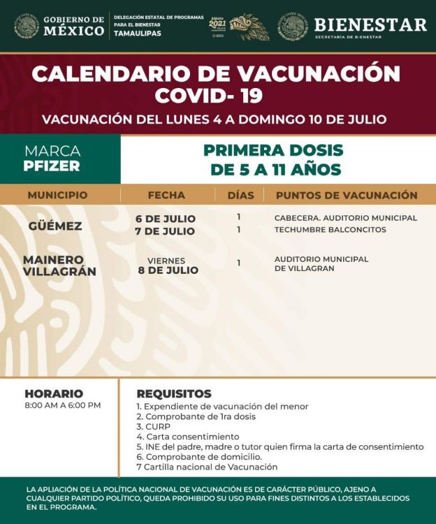 CIUDAD VICTORIA.-  La Delegación de Programas Federales para el  Desarrollo dio a conocer que el próximo lunes arranca en Tamaulipas la aplicación de la primera dosis contra covid-19 en  niños de cinco a once años de edad.