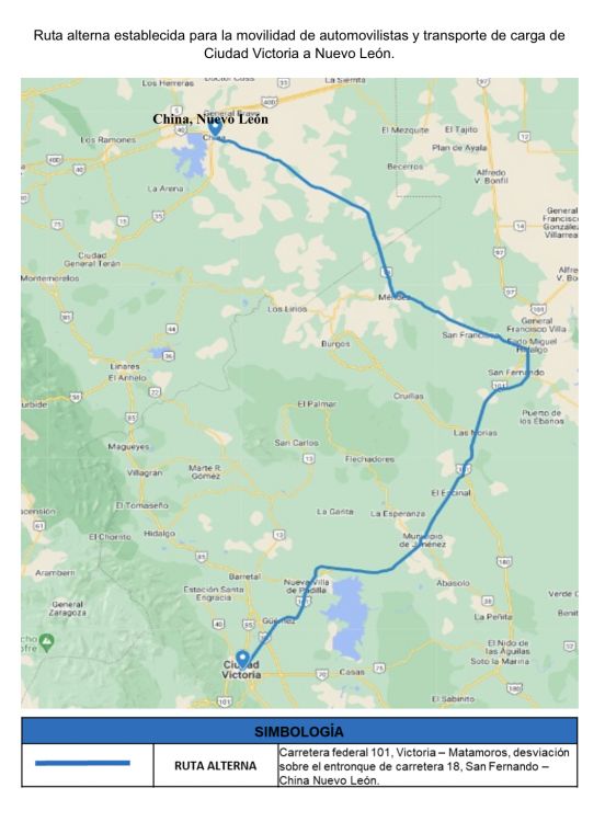 Una alternativa establecida, en coordinación con autoridades de Nuevo León, es cruzar por el municipio de Méndez hacia el estado vecino. Otra opción es avanzar por la carretera nacional 85 hacia Padilla y de ahí tomar la carretera a Reynosa para luego avanzar hacia Monterrey desde esa ciudad fronteriza.