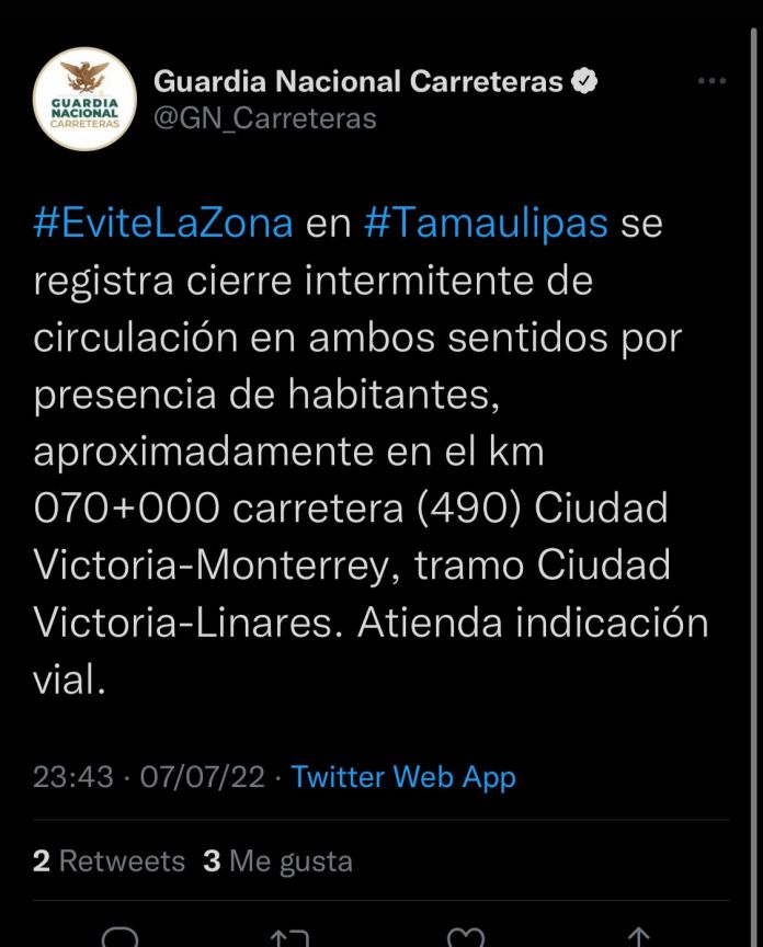 Después de circular algunas versiones en ese sentido, la Guardia Nacional Carreteras confirmó a través de redes sociales que durante los últimos minutos del jueves se registró el cierre intermitente de la circulación vehicular de nueva cuenta en la carretera Victoria – Monterrey provocado por habitantes de la zona.