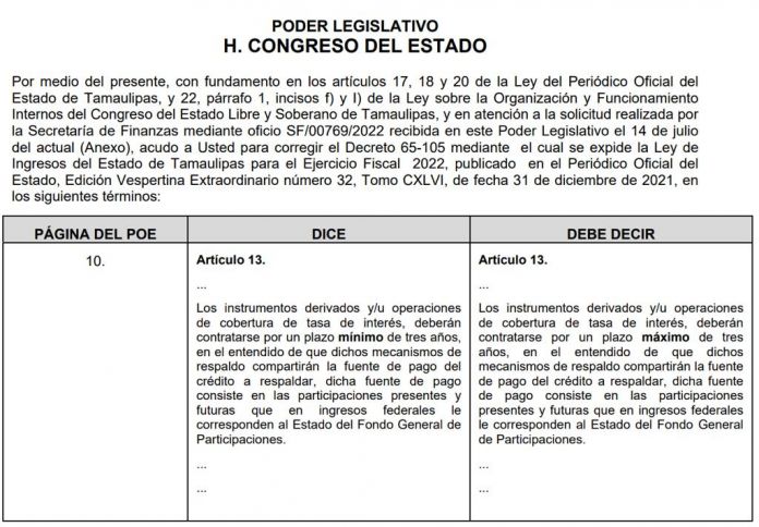 El 19 de julio de 2022 en el Periódico Oficial del Estado se publicó una fe de erratas con relación al Decreto 65-105, originalmente publicado el 31 de diciembre del 2021, mediante el cual se expide la Ley de Ingresos del Estado para el Ejercicio 2022.