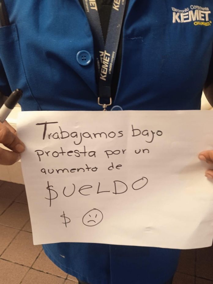 Cabe señalar que el día de ayer trascendió a través de redes sociales que trabajadores de la maquiladora Kemet llevan a cabo sus labores portando diversas cartulinas donde manifiestan su inconformidad trabajando bajo protesta porque aún no les llega el aumento de sueldo.