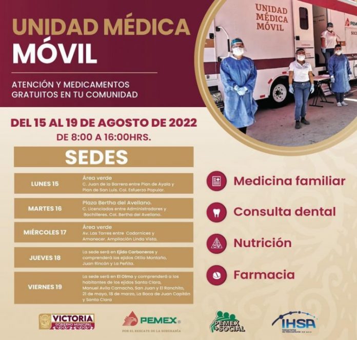 CIUDAD VICTORIA.- Con atención médica y farmacia completamente gratis, a partir del lunes 15 y hasta el próximo viernes 19 de agosto, la Unidad Médica Móvil de Pemex estará en esta Ciudad Capital.