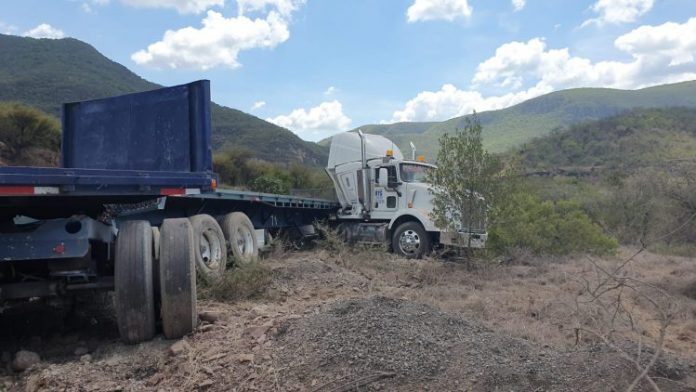 Cd.Victoria, Tam.- Un trailero sufrió un accidente, cuando al esquivar un burro que se atravesó sobre la carretera perdió el control y abandonó la superficie de rodamiento quedando embancado.