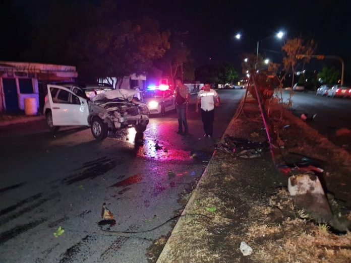 El vehículo continúa con su trayectoria hasta estrellarse contra una luminaria la cual derribó en su totalidad.