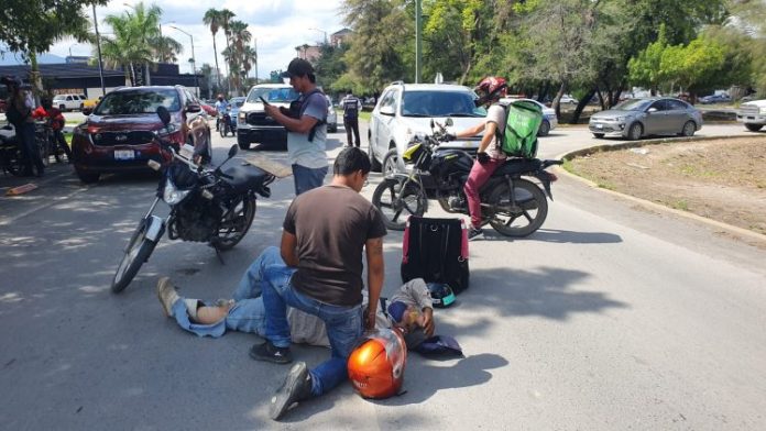 Un repartidor de Fliver resultó lesionado tras ser derribado por una camioneta que tomó un retorno frente a Soriana Palmas.