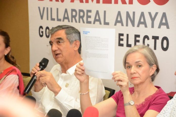 En conferencia de prensa, el doctor Américo Villarreal Anaya, gobernador electo de Tamaulipas, presentó a los medios de comunicación documentos oficiales que comprueban que las versiones periodísticas que involucraban a su hijo con cuentas bancarias en instituciones holandesas son totalmente falsas y que los documentos exhibidos son apócrifos.