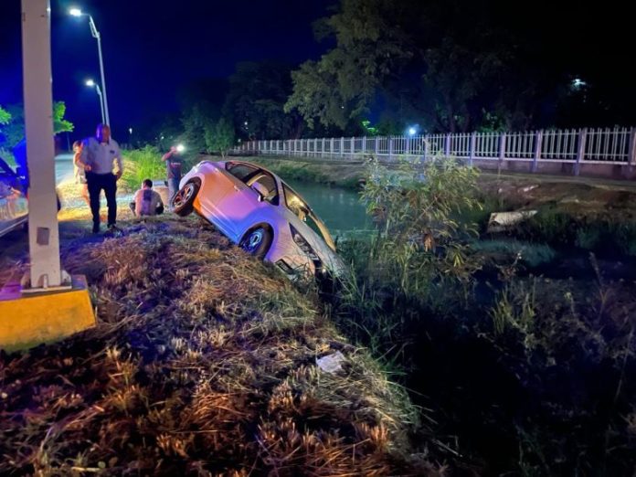 Tránsito dijo que el profesor manejaba un automóvil Nissan Sentra y aparentemente intentó dar la vuelta antes de tiempo por lo que quedó embancado a la orilla del canal, a nada de caer en el agua.