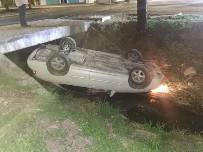 El conductor de un automóvil que se distrajo cuando le timbro el celular, terminó perdiendo el control hasta caer en un dren pluvial dónde quedó volcado