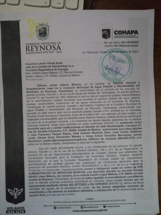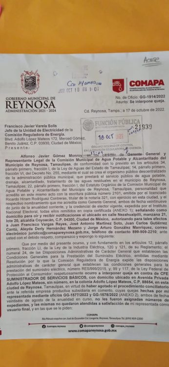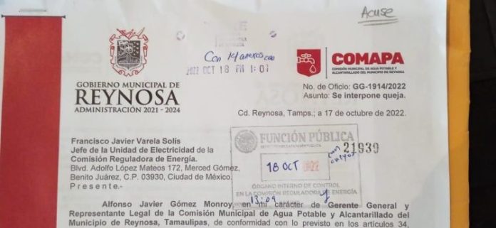 Con anticipación la Comisión Municipal de Agua Potable y Alcantarillado de Reynosa contaba con dos fundamentos legales para seguir contando con el suministro por parte de la CFE, uno ante la Comisión Reguladora de Energía y el otro ante un Juzgado Federal, lo que revela el mal proceder de la dependencia, que tuvo por vistos y recibidos los documentos correspondientes.