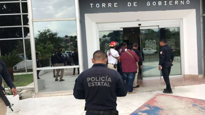 Para proceder a la revisión del inmueble que se encuentra en la Unidad Gubernamental José López Portillo se utilizó un binomio canino de la Secretaría de Seguridad Pública así como personal de Protección Civil de Gobierno del Estado, Protección Civil Municipal y elementos de la Fiscalía General de Justicia del Estado.