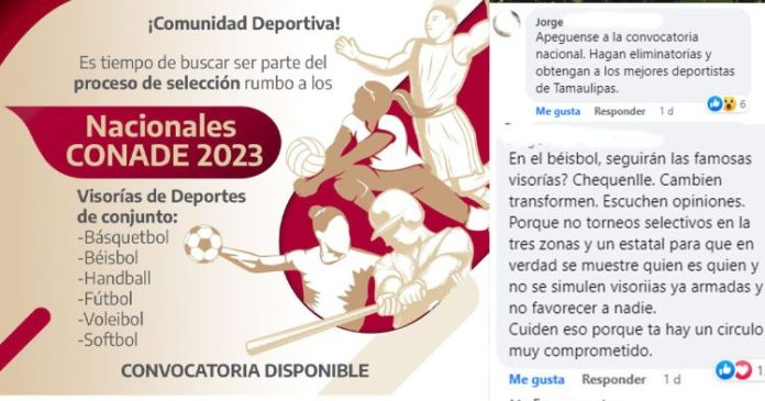 Tras el anuncio que hizo el Instituto del Deporte en Tamaulipas, (INDE) sobre las visorías para los deportes de conjunto entrenadores y deportistas rechazaron el que se vuelva a utilizar el mismo método que realizó el gobierno anterior y pidieron que se realicen a través de eliminatorias para escoger a los jugadores que representarán a Tamaulipas