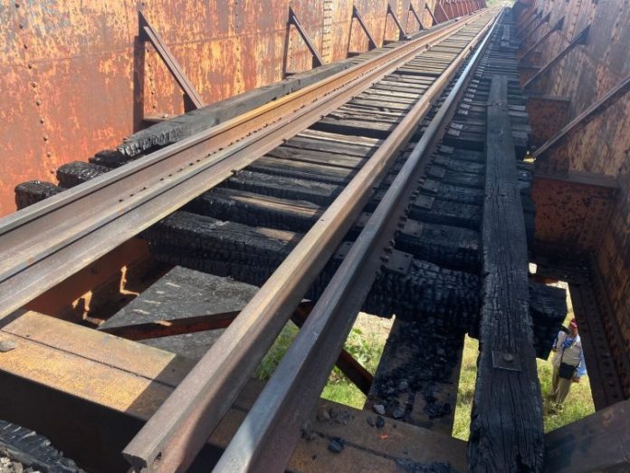 El siniestro que convirtió en carbón los durmientes ocurrió a la altura del Ejido Congregación Caballeros justo donde la vía del tren pasa por un puente que se encuentra sobre el lecho seco de un río.