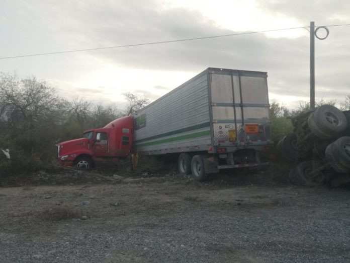 Jaumave, Tamaulipas.-Debido a las ligeras lluvias que se han presentado en diferentes municipios, un tráiler marca Kenworth se salió de la cinta asfáltica al circular por el kilómetro 130 de la carretera federal 101 a la altura de Jaumave.