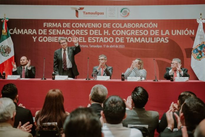 Ciudad Victoria, Tamaulipas. La transformación de México y de Tamaulipas demanda compromiso y disposición para dejar atrás las prácticas de políticas regresivas, que pervertían el verdadero sentido del servicio público, afirmó el gobernador de Tamaulipas Américo Villarreal Anaya, en el marco del convenio de colaboración que signó el gobierno estatal con la Cámara de Senadores del Congreso de la Unión, para brindar capacitación y profesionalización a las y los trabajadores.