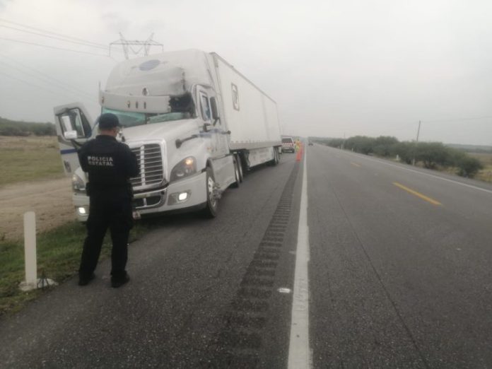 Ciudad Victoria, Tamaulipas.-Personal de la Guardia Estatal acudió en auxilio del conductor de un tráiler quien resultó lesionado luego de que el neumático de otra unidad se impactara sobre el parabrisas al circular por el kilómetro 30 de la Carretera Federal 83.