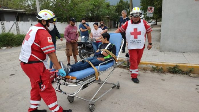Paramédicos de Cruz Roja acudieron al lugar para atender a los jóvenes quienes viajaban a bordo de una motocicleta, al parecer marca Itálika.