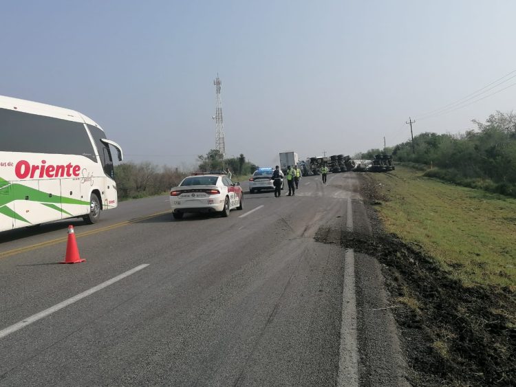 Tamaulipas.- Aparentemente el exceso de velocidad provocó la volcadura de un autotanque el cual provocó el cierre parcial de la carretera.