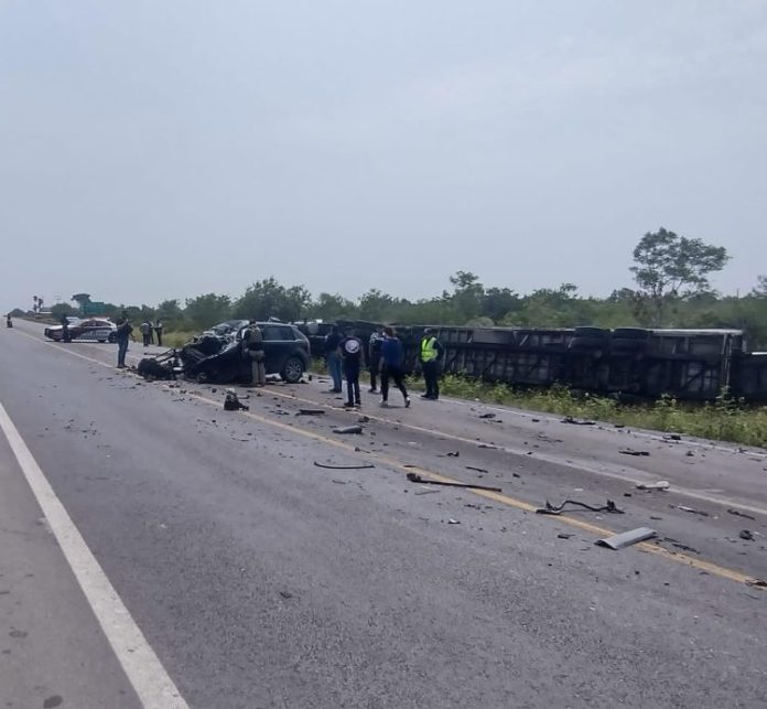 San Fernando, Tamaulipas.- Derivado del choque de un automóvil y un tráiler que transportaba vehículos de una empresa particular a la altura del kilómetro 13 del Libramiento San Fernando, dos personas, una mujer y un hombre perdieron la vida y una menor con lesiones leves fue trasladada para recibir atención médica en el Hospital General de San Fernando.