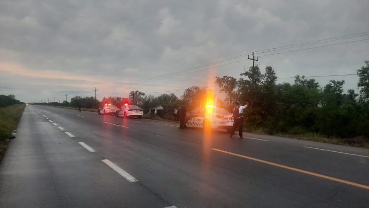 REYNOSA Tamaulipas.-Personal de la Guardia Estatal asignado a la Estación Segura Periquitos acudió al kilómetro 55 de la Carretera Federal 97 Reynosa-San Fernando para atender el reporte de una volcadura de tractocamión.