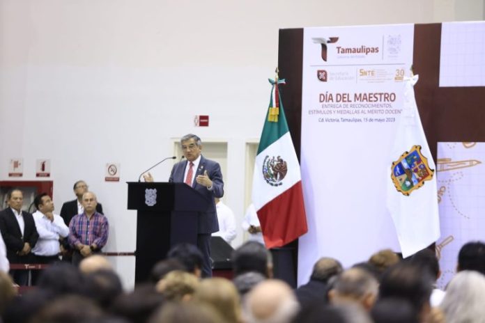 Al encabezar este mediodía la entrega de reconocimientos, estímulos y medallas al mérito docente, en el marco de la celebración del Día del Maestro, el gobernador reiteró su compromiso para trabajar a fin de mejorar la posición de Tamaulipas en los indicadores nacionales y compensar el esfuerzo de las y los trabajadores de la educación, haciendo valer y respetando sus derechos, además de mejorar las condiciones generales, la enseñanza, el aprendizaje y revertir el rezago en materia educativa.