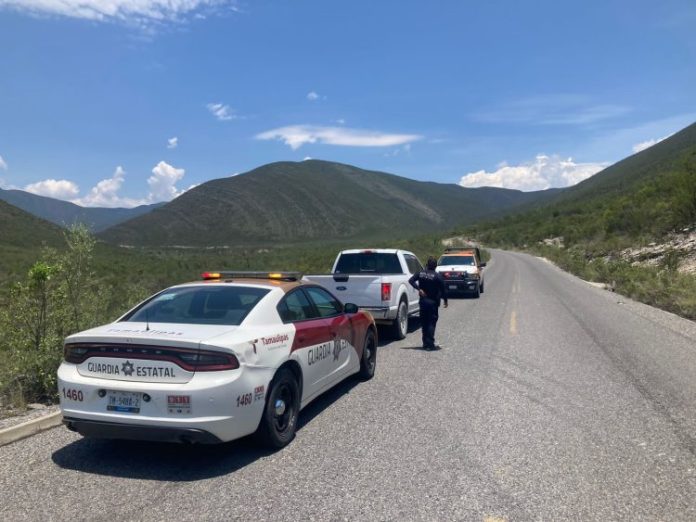 Palmillas, Tamaulipas.-Personal de la Guardia Estatal en el municipio de Palmillas brindó apoyo carretero ante la volcadura de un tractocamión que cayó al fondo de un barranco en la Carretera Estatal 79.