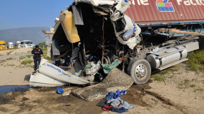 Jaumave, Tamaulipas.- Derivado de un accidente vial que involucró a un tractocamión de la empresa Fletes Marroquín, la circulación se encuentra obstruida en ambos carriles de la Carretera Federal 101 a la altura del kilómetro 108 en el municipio de Jaumave.