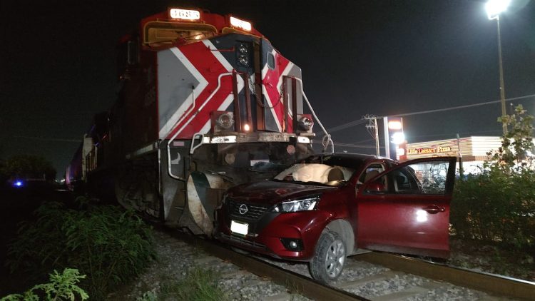 Cd. Victoria, Tam.- Vaya que corrió con mucha suerte un joven que manejaba un Nissan March luego de que el tren lo chocara y lo arrastrara por dos cuadras.