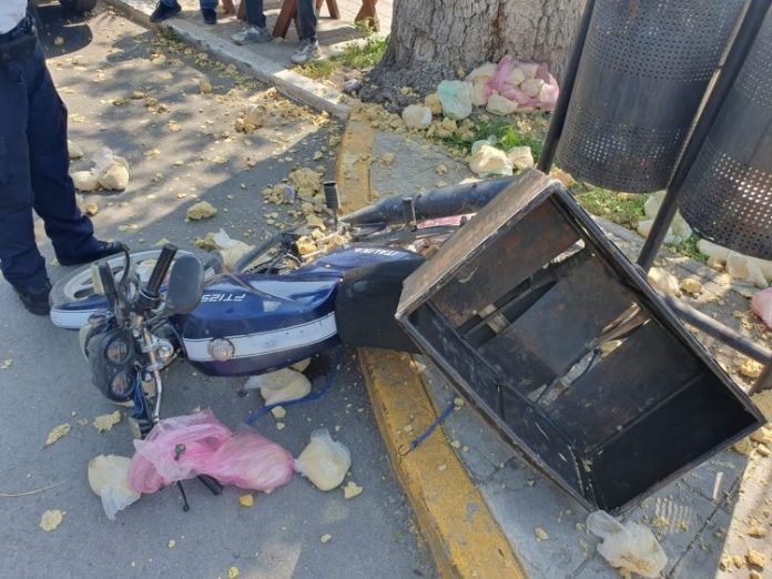 El conductor de una camioneta que no respetó el alto correspondiente terminó por impactar a un repartidor que transportaba masa y la cual quedó regada por todo el suelo.
